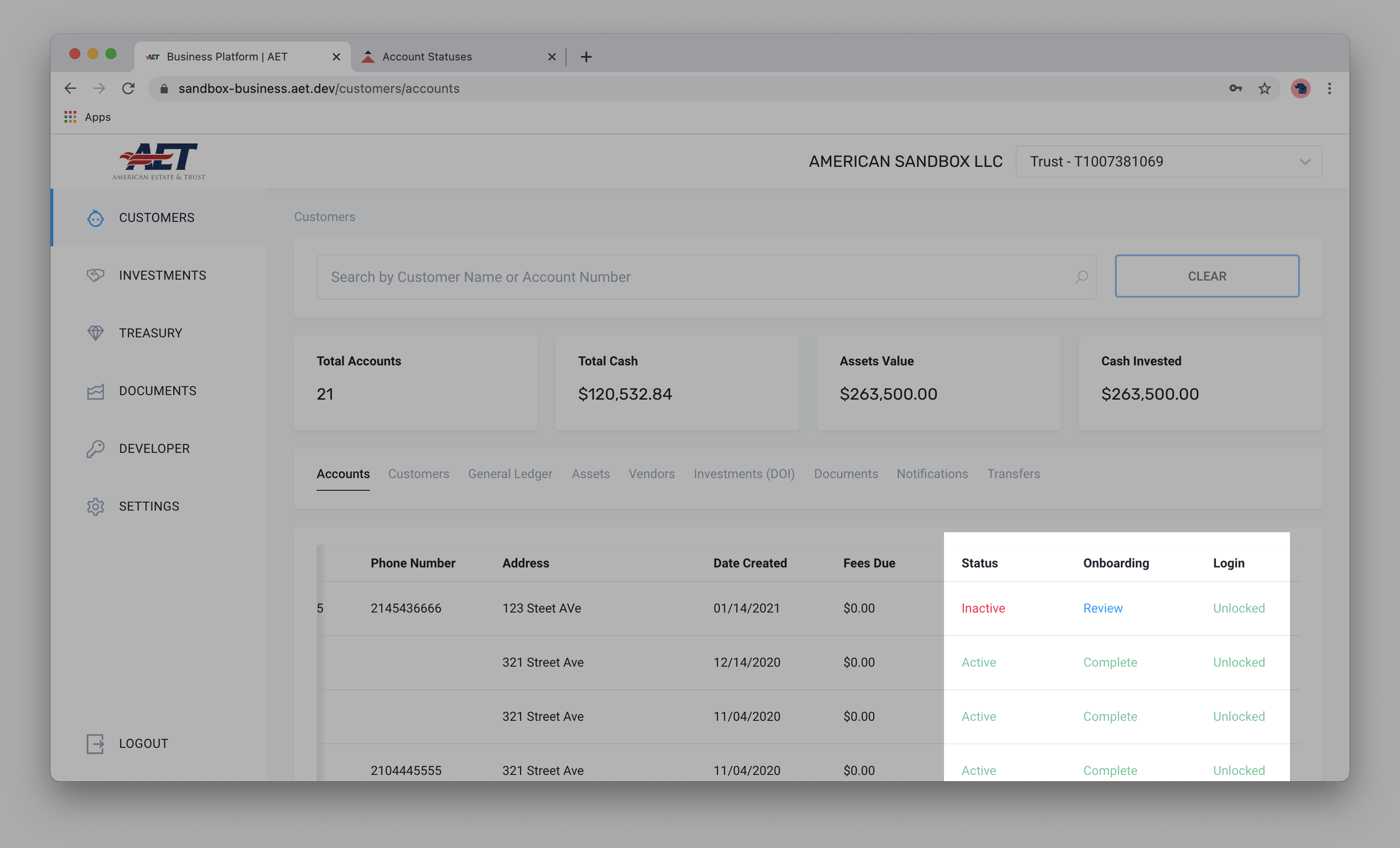 If you suspect there is an error with the Onboarding status of an account, please reach out to Customer Support at support@aetrust.com.