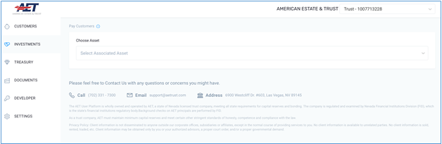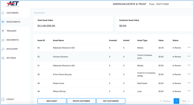 At the bottom-left of the page are buttons prompting you to a) create a New Asset, b) Invite Customer or c) Pay Customers.