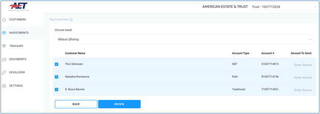 Are You the Investment Recipient? This is a Yes/No choice. If you select “Yes,” then funds would transfer from client accounts to your account on AET. If you select “No,” then you would be prompted to Select Vendor from a pull-down menu, and funds would flow to the selected third party. If the desired vendor is not on the menu, it will prompt you to click on an Add New Vendor link.