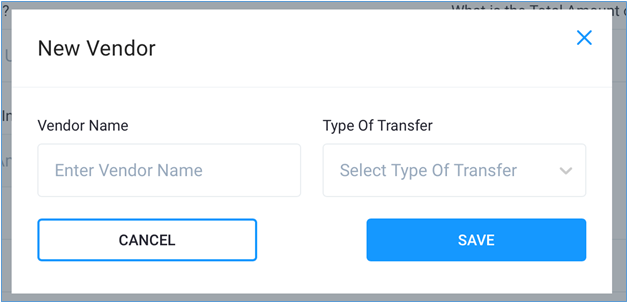 A new Vendor entry would require you to enter a) a name and b) a type of transfer. The Name field is open text. The Type of Transfer field is a choice between a) Wire and b) Check.