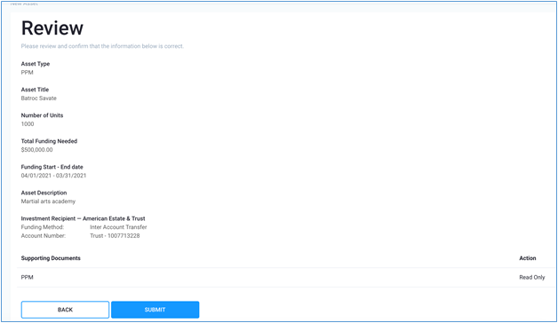 Click the Back button to edit the form or the Submit button to enter it. If you hit the Submit button, you will return to the updated Investments tab.